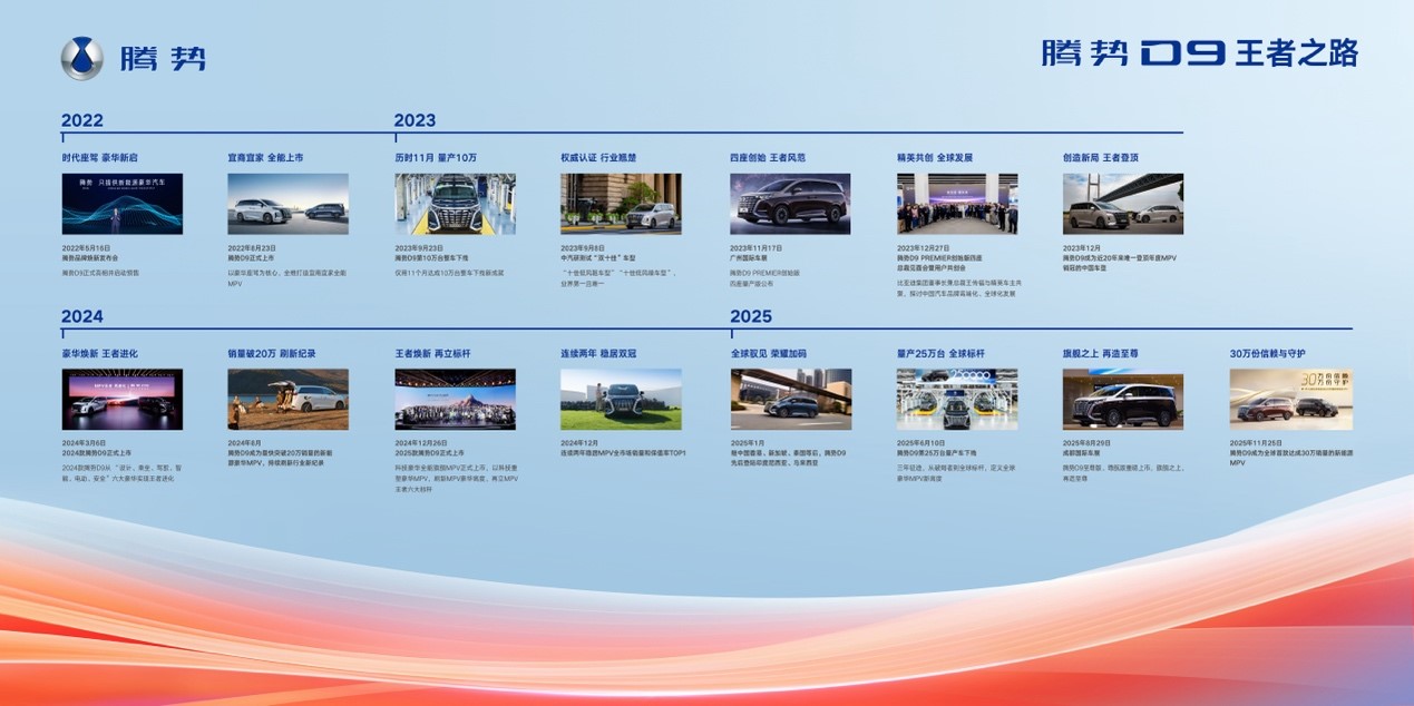 腾势D9的成功,是中国品牌创新发展之路的一个缩影。作为全球首款达成第30万辆交付的新能源MPV,腾势D9如今在更高的起点上持续突破。在不远的将来,MPV冠军腾势D9将持续获得精英圈层的认同,与每一位用户一起向着美好生活,腾势而上!