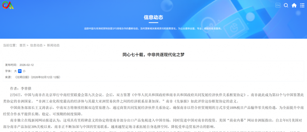 2026年,正值中非建交70周年这一重要历史节点,中非始终携手同行。2026年3月,中国国家副主席对南非进行正式访问,并与南非副总统共同主持召开中南国家双边委员会会议,进一步夯实两国高层互信与机制化合作基础,推动中南关系持续向“新时代全方位战略合作伙伴关系”迈进。